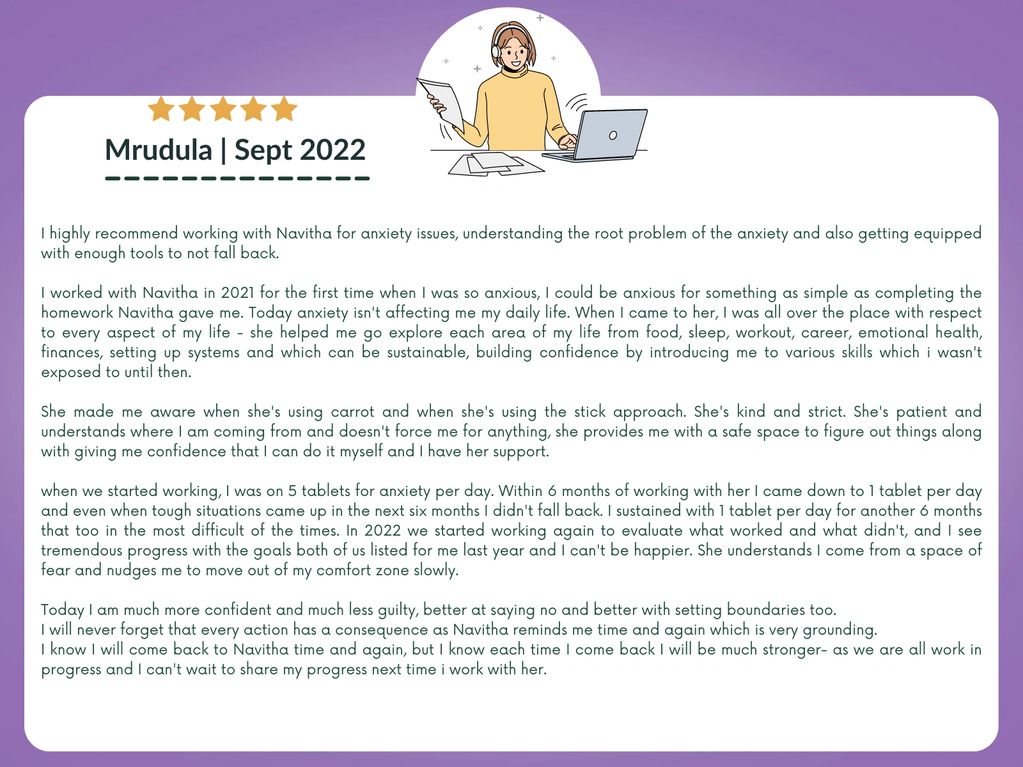 Mrudula has put in consistent efforts to come out of diagnosed anxiety & is courageously working to rebuild her life as a student in a new country